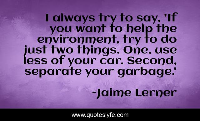This page presents the quote "I always try to say, 'If you want to help the environment, try to do just two things. One, use less of your car. Second, separate your garbage.'". Author of this quote is Jaime Lerner. This quote is about environment, help,.