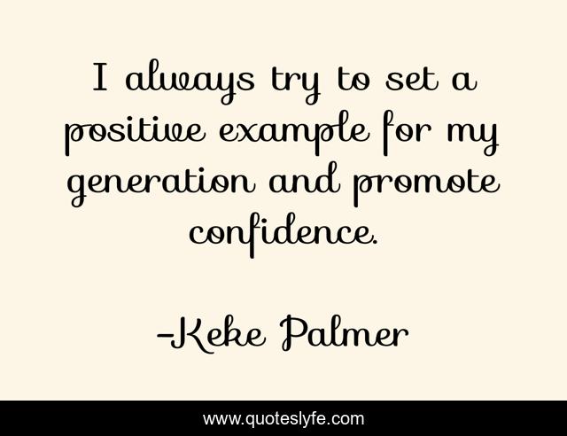 This page presents the quote "I always try to set a positive example for my generation and promote confidence.". Author of this quote is Keke Palmer. This quote is about generation, try, confidence,.