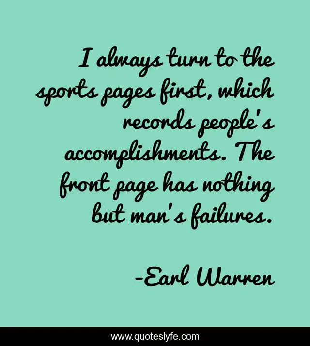 This page presents the quote "I always turn to the sports pages first, which records people's accomplishments. The front page has nothing but man's failures.". Author of this quote is Earl Warren. This quote is about man, page, people,.