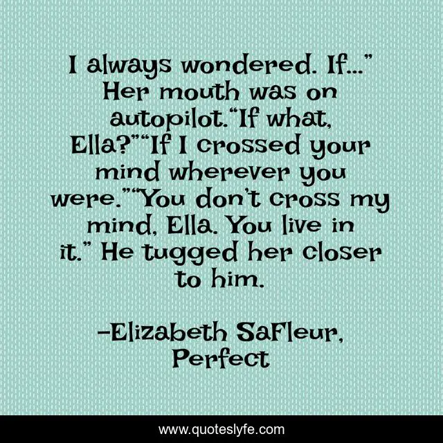 This page presents the quote "I always wondered. If…” Her mouth was on autopilot.“If what, Ella?”“If I crossed your mind wherever you were.”“You don’t cross my mind, Ella. You live in it.” He tugged her closer to him.". Author of this quote is Elizabeth SaFleur, Perfect. This quote is about domestic-discipline, erotic-romance,.