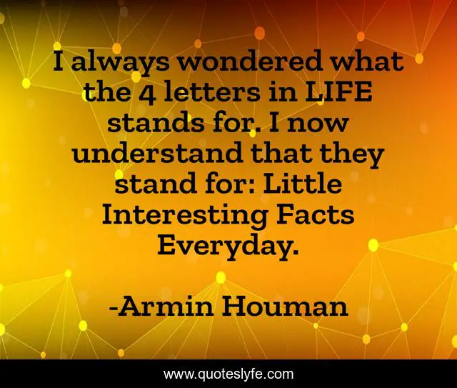 This page presents the quote "I always wondered what the 4 letters in LIFE stands for. I now understand that they stand for: Little Interesting Facts Everyday.". Author of this quote is Armin Houman. This quote is about life, interesting, little, quote, facts, everyday, motivation, inspiration,.