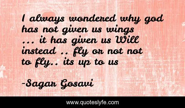 This page presents the quote "I always wondered why god has not given us wings ... it has given us Will instead .. fly or not not to fly.. its up to us". Author of this quote is Sagar Gosavi. This quote is about fly, wings,.