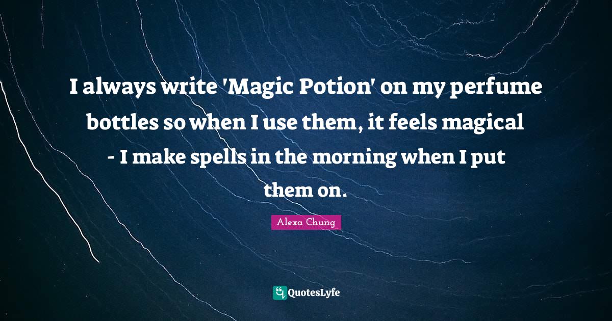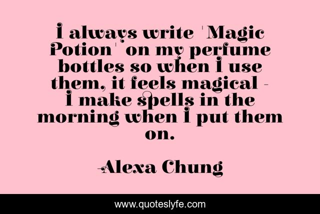 This page presents the quote "I always write 'Magic Potion' on my perfume bottles so when I use them, it feels magical - I make spells in the morning when I put them on.". Author of this quote is Alexa Chung. This quote is about always, magic, perfume,.