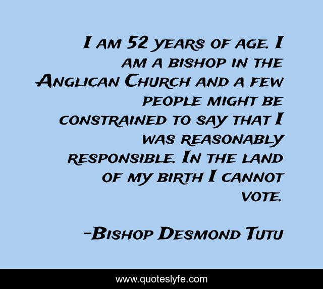 This page presents the quote "I am 52 years of age. I am a bishop in the Anglican Church and a few people might be constrained to say that I was reasonably responsible. In the land of my birth I cannot vote.". Author of this quote is Bishop Desmond Tutu. This quote is about bigotry, prejudice,.