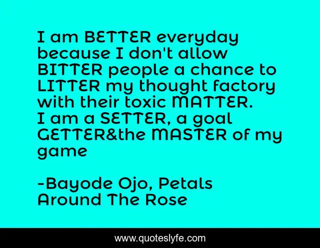 This page presents the quote "I am BETTER everyday because I don't allow BITTER people a chance to LITTER my thought factory with their toxic MATTER. I am a SETTER, a goal GETTER&the MASTER of my game". Author of this quote is Bayode Ojo, Petals Around The Rose. This quote is about better, goal-getter, game, bitter, master,.