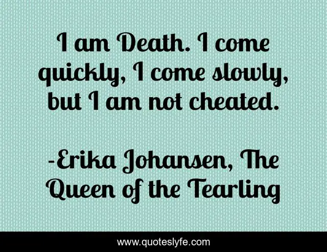 This page presents the quote "I am Death. I come quickly, I come slowly, but I am not cheated.". Author of this quote is Erika Johansen, The Queen of the Tearling. .