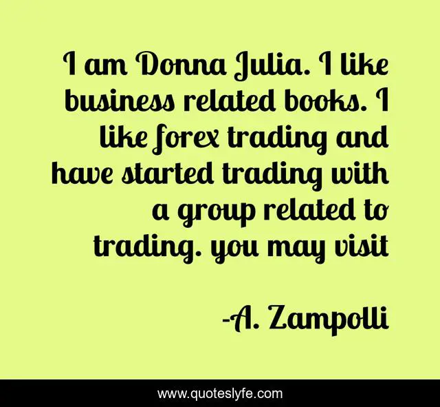 This page presents the quote "I am Donna Julia. I like business related books. I like forex trading and have started trading with a group related to trading. you may visit". Author of this quote is A. Zampolli. This quote is about trading, business,.