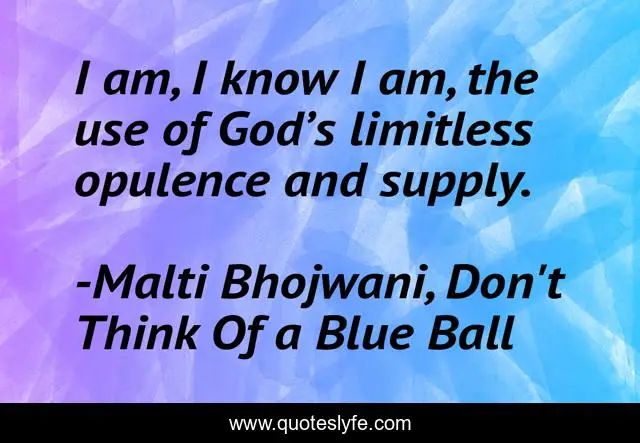 This page presents the quote "I am, I know I am, the use of God’s limitless opulence and supply.". Author of this quote is Malti Bhojwani, Don't Think Of a Blue Ball. This quote is about abundance, wealth, money, flow, mantra, money-mantra, manifesting-wealth,.
