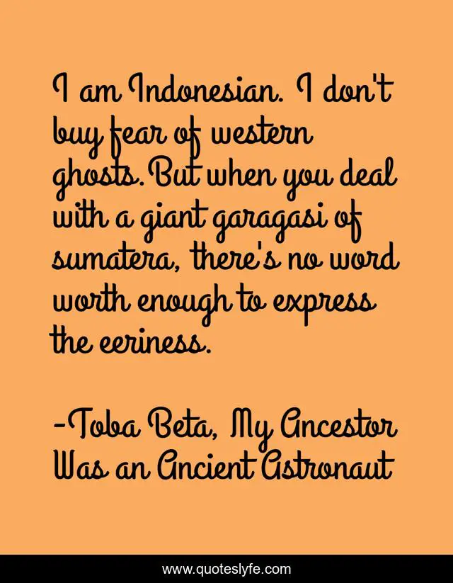 "Toba Beta, My Ancestor Was an Ancient Astronaut Quotes." Quoteslyfe.com, 2025. Mon. 08 Dec. 2025. <https://www.quoteslyfe.com/quote/I-am-Indonesian-I-don-t-buy-45391>.