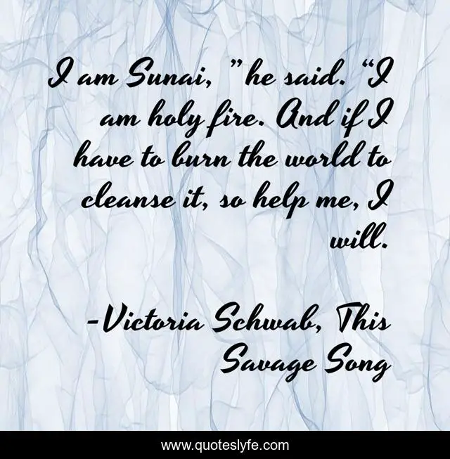 This page presents the quote "I am Sunai, ” he said. “I am holy fire. And if I have to burn the world to cleanse it, so help me, I will.". Author of this quote is Victoria Schwab, This Savage Song. This quote is about god, monster,.