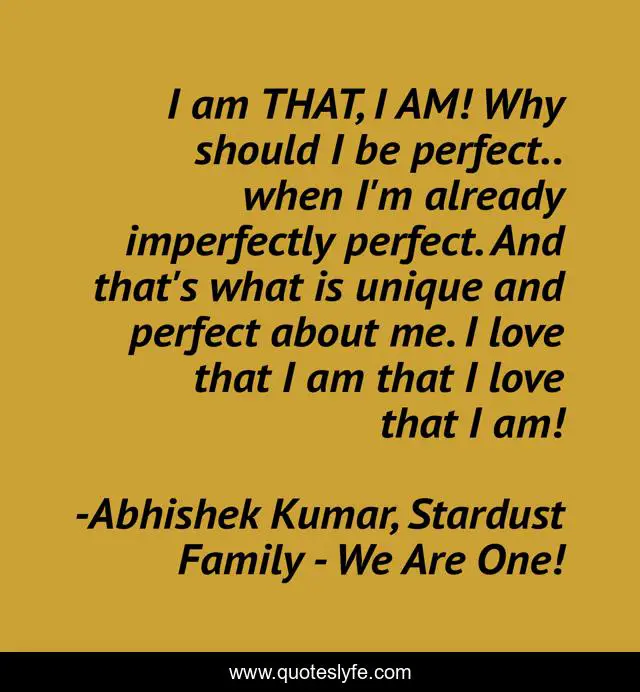 This page presents the quote "I am THAT, I AM! Why should I be perfect.. when I'm already imperfectly perfect. And that's what is unique and perfect about me. I love that I am that I love that I am!". Author of this quote is Abhishek Kumar, Stardust Family - We Are One!. This quote is about stardust-family, abhishek-kumar, imperfection, abhishek-kumar-india, stardust, i-am-that-i-am, perfection,.