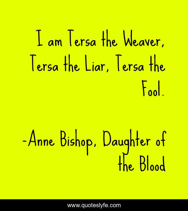 This page presents the quote "I am Tersa the Weaver, Tersa the Liar, Tersa the Fool.". Author of this quote is Anne Bishop, Daughter of the Blood. This quote is about opening-lines, tersa, black-jewels, the-black-jewels-trilogy, witch, witches, anne-bishop, prologue, beginning,.