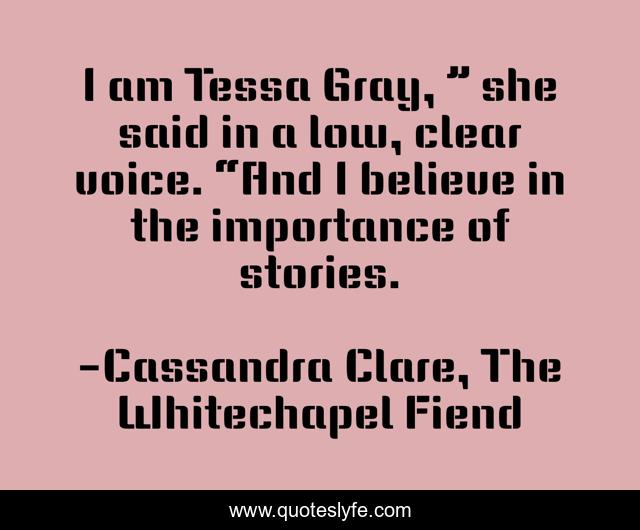 This page presents the quote "I am Tessa Gray, ” she said in a low, clear voice. “And I believe in the importance of stories.". Author of this quote is Cassandra Clare, The Whitechapel Fiend. This quote is about importance, stories, tessa-gray,.