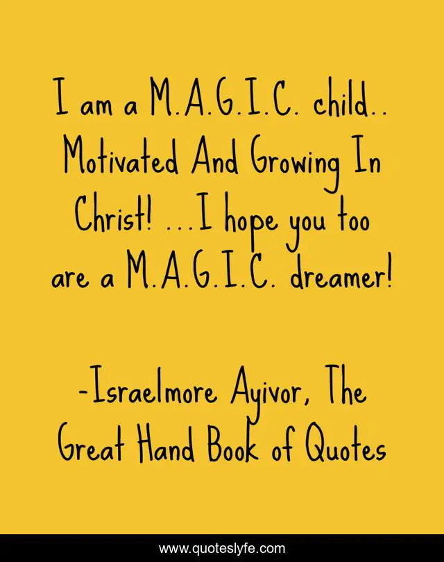 This page presents the quote "I am a M.A.G.I.C. child.. Motivated And Growing In Christ! …I hope you too are a M.A.G.I.C. dreamer!". Author of this quote is Israelmore Ayivor, The Great Hand Book of Quotes. This quote is about jesus-christ, food-for-thought, magic, christ, motivate, magical, jesus, dreamers, growth,.