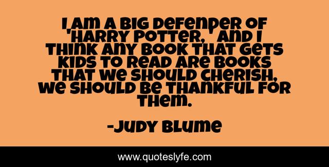 This page presents the quote "I am a big defender of 'Harry Potter, ' and I think any book that gets kids to read are books that we should cherish, we should be thankful for them.". Author of this quote is Judy Blume. This quote is about book, be thankful,.