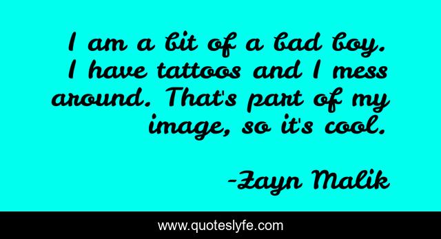 This page presents the quote "I am a bit of a bad boy. I have tattoos and I mess around. That's part of my image, so it's cool.". Author of this quote is Zayn Malik. This quote is about boy, bad,.