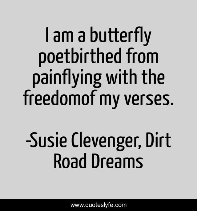 This page presents the quote "I am a butterfly poetbirthed from painflying with the freedomof my verses.". Author of this quote is Susie Clevenger, Dirt Road Dreams. This quote is about life, journey, poetry, dreams, dirt-road,.