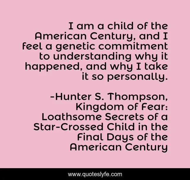 This page presents the quote "I am a child of the American Century, and I feel a genetic commitment to understanding why it happened, and why I take it so personally.". Author of this quote is Hunter S. Thompson, Kingdom of Fear: Loathsome Secrets of a Star-Crossed Child in the Final Days of the American Century. .