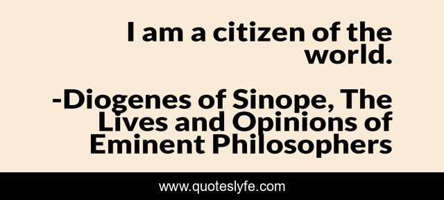 This page presents the quote "I am a citizen of the world.". Author of this quote is Diogenes of Sinope, The Lives and Opinions of Eminent Philosophers. This quote is about philosophy, cynicism,.
