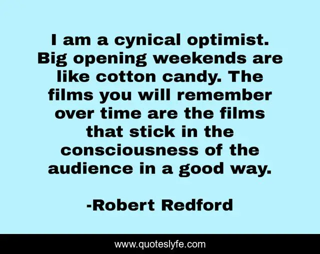 This page presents the quote "I am a cynical optimist. Big opening weekends are like cotton candy. The films you will remember over time are the films that stick in the consciousness of the audience in a good way.". Author of this quote is Robert Redford. This quote is about good, time,.