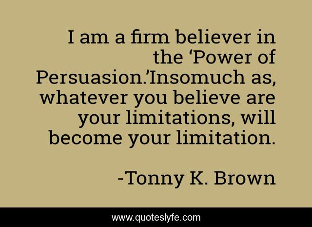This page presents the quote "I am a firm believer in the ‘Power of Persuasion.’Insomuch as, whatever you believe are your limitations, will become your limitation.". Author of this quote is Tonny K. Brown. This quote is about inspirational-life, inspirational-living,.