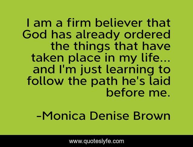 This page presents the quote "I am a firm believer that God has already ordered the things that have taken place in my life... and I'm just learning to follow the path he's laid before me.". Author of this quote is Monica Denise Brown. This quote is about god, life, path,.