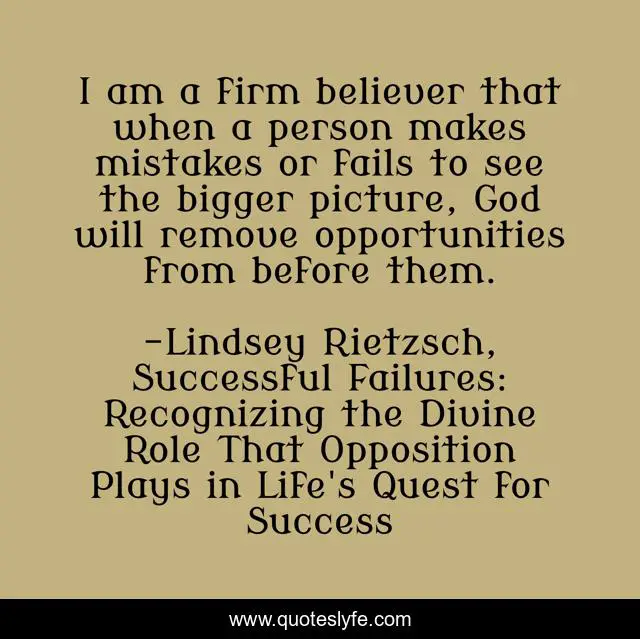 This page presents the quote "I am a firm believer that when a person makes mistakes or fails to see the bigger picture, God will remove opportunities from before them.". Author of this quote is Lindsey Rietzsch, Successful Failures: Recognizing the Divine Role That Opposition Plays in Life's Quest for Success. This quote is about errors, god, mistakes, opportunity, sin, motivational-speaker,.