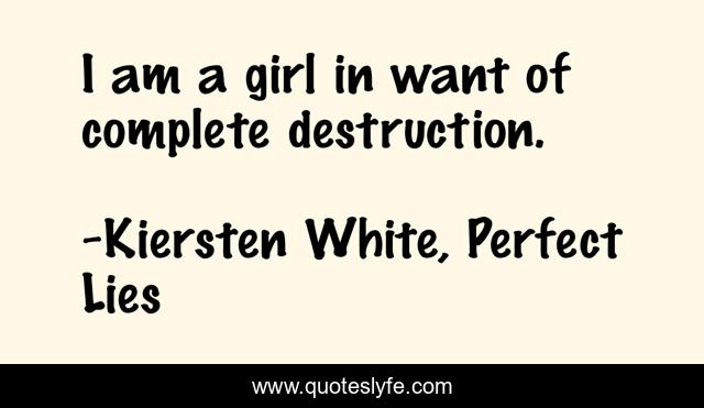 This page presents the quote "I am a girl in want of complete destruction.". Author of this quote is Kiersten White, Perfect Lies. This quote is about broken, fia,.