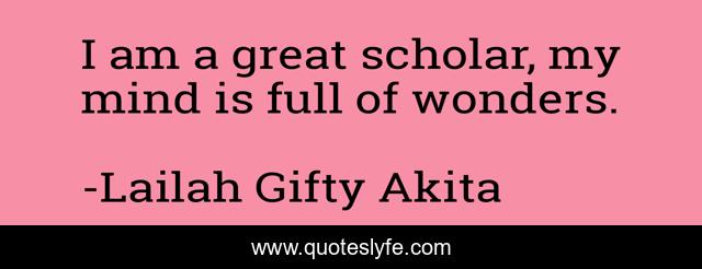 This page presents the quote "I am a great scholar, my mind is full of wonders.". Author of this quote is Lailah Gifty Akita. This quote is about mind-and-body, mind-and-spirit, scholarships, scholar, mind-and-sense, mind-and-soul, scholarly, wonder-woman, scholarship,.