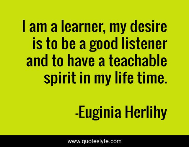 This page presents the quote "I am a learner, my desire is to be a good listener and to have a teachable spirit in my life time.". Author of this quote is Euginia Herlihy. .