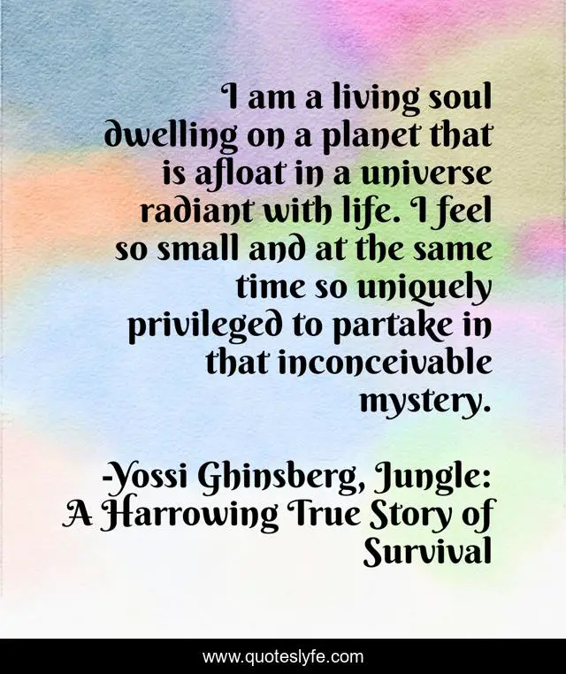 This page presents the quote "I am a living soul dwelling on a planet that is afloat in a universe radiant with life. I feel so small and at the same time so uniquely privileged to partake in that inconceivable mystery.". Author of this quote is Yossi Ghinsberg, Jungle: A Harrowing True Story of Survival. This quote is about earth, spirituality, inspirational, enthusiasm,.