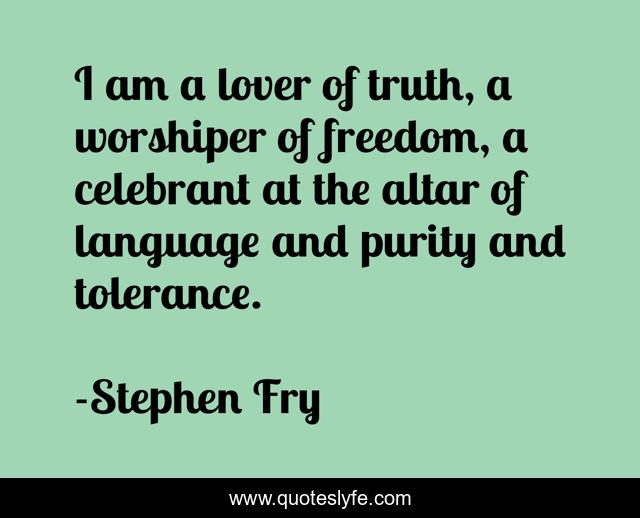This page presents the quote "I am a lover of truth, a worshiper of freedom, a celebrant at the altar of language and purity and tolerance.". Author of this quote is Stephen Fry. This quote is about freedom, tolerance, language, truth,.