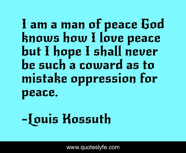 This page presents the quote "I am a man of peace God knows how I love peace but I hope I shall never be such a coward as to mistake oppression for peace.". Author of this quote is Louis Kossuth. .