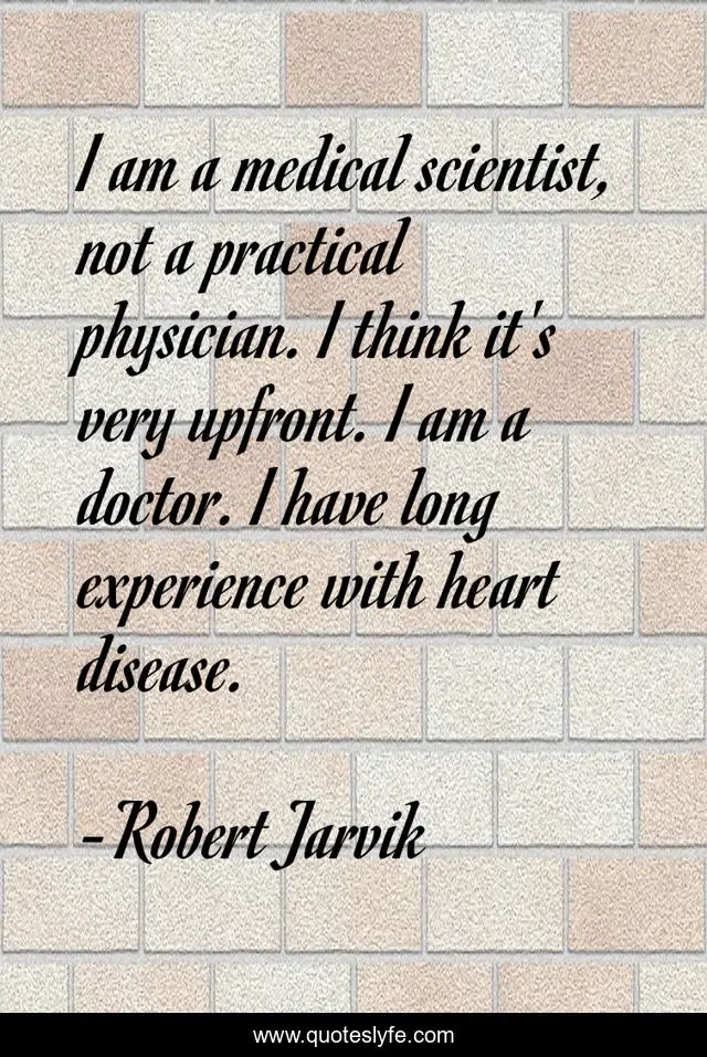 This page presents the quote "I am a medical scientist, not a practical physician. I think it's very upfront. I am a doctor. I have long experience with heart disease.". Author of this quote is Robert Jarvik. This quote is about heart, experience,.