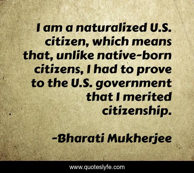 This page presents the quote "I am a naturalized U.S. citizen, which means that, unlike native-born citizens, I had to prove to the U.S. government that I merited citizenship.". Author of this quote is Bharati Mukherjee. This quote is about citizenship, citizen,.