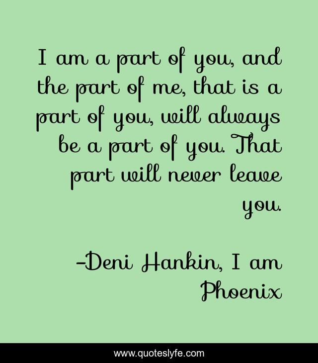 This page presents the quote "I am a part of you, and the part of me, that is a part of you, will always be a part of you. That part will never leave you.". Author of this quote is Deni Hankin, I am Phoenix. This quote is about afterlife, love, affection, spirituality,.