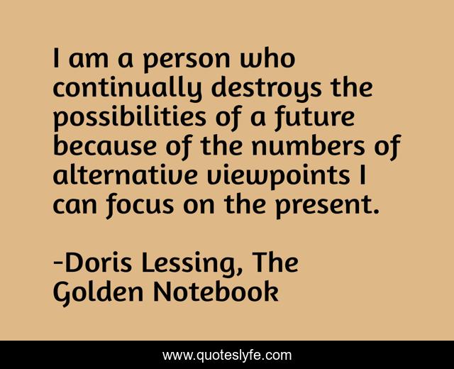 This page presents the quote "I am a person who continually destroys the possibilities of a future because of the numbers of alternative viewpoints I can focus on the present.". Author of this quote is Doris Lessing, The Golden Notebook. This quote is about future, planning,.