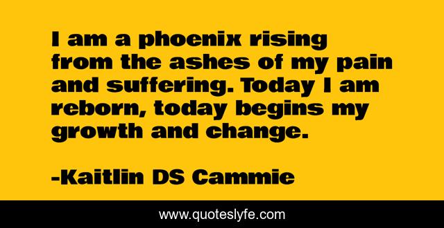 This page presents the quote "I am a phoenix rising from the ashes of my pain and suffering. Today I am reborn, today begins my growth and change.". Author of this quote is Kaitlin DS Cammie. This quote is about reborn, growth, change, phoenix,.
