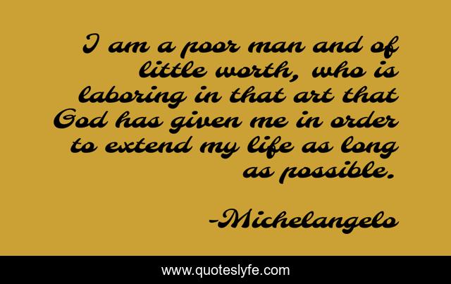 This page presents the quote "I am a poor man and of little worth, who is laboring in that art that God has given me in order to extend my life as long as possible.". Author of this quote is Michelangelo. This quote is about life, art,.