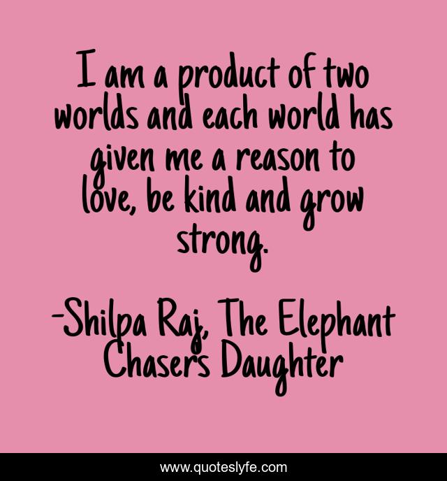 This page presents the quote "I am a product of two worlds and each world has given me a reason to love, be kind and grow strong.". Author of this quote is Shilpa Raj, The Elephant Chaser's Daughter. .