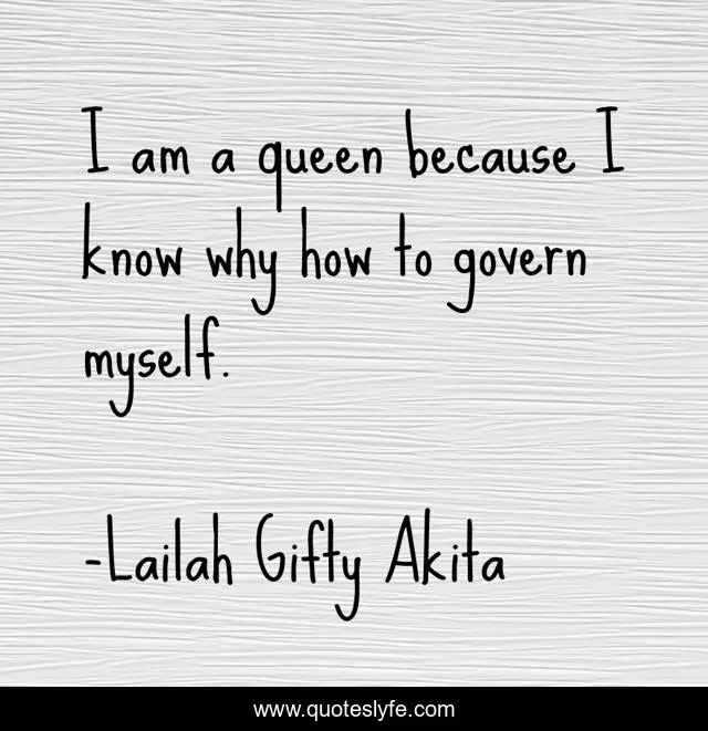 This page presents the quote "I am a queen because I know why how to govern myself.". Author of this quote is Lailah Gifty Akita. This quote is about myself, queen, myself-be-yourself, yourself, rules-of-life, govern, myself-upon-the-earth,.