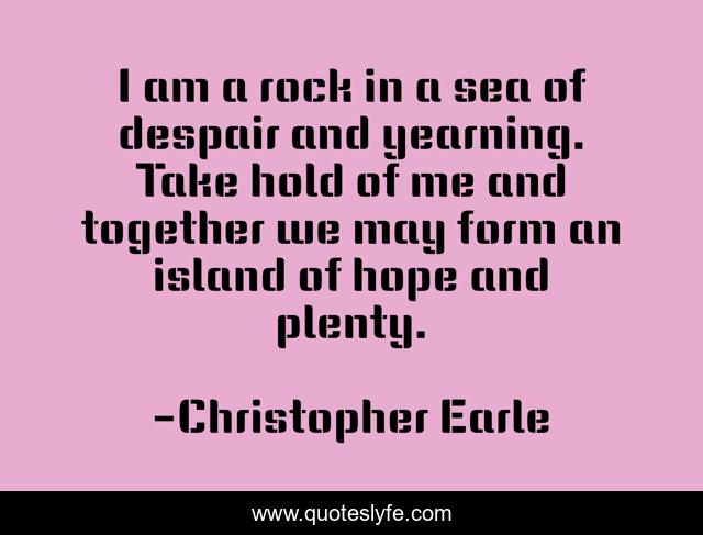 This page presents the quote "I am a rock in a sea of despair and yearning. Take hold of me and together we may form an island of hope and plenty.". Author of this quote is Christopher Earle. This quote is about confidence, inspriational, positive, motivational, philosophical, optimistic,.