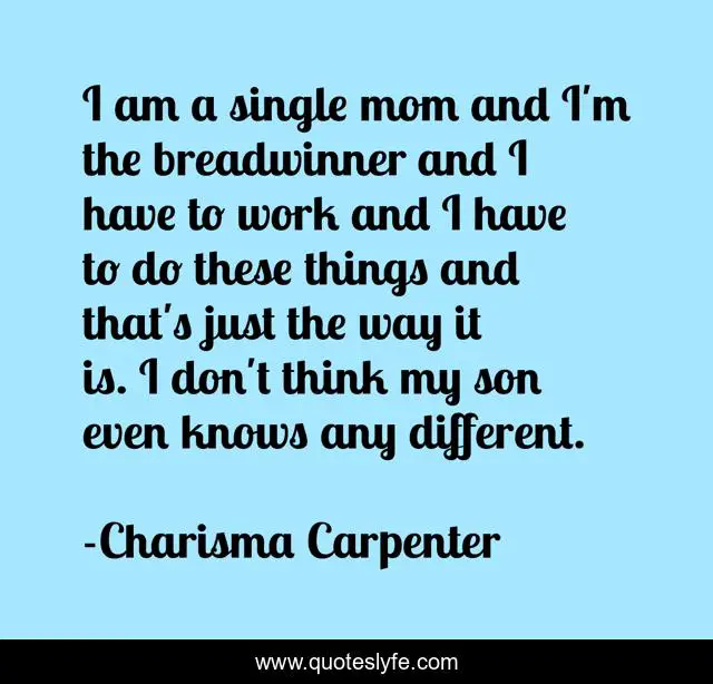 This page presents the quote "I am a single mom and I'm the breadwinner and I have to work and I have to do these things and that's just the way it is. I don't think my son even knows any different.". Author of this quote is Charisma Carpenter. This quote is about work, son,.