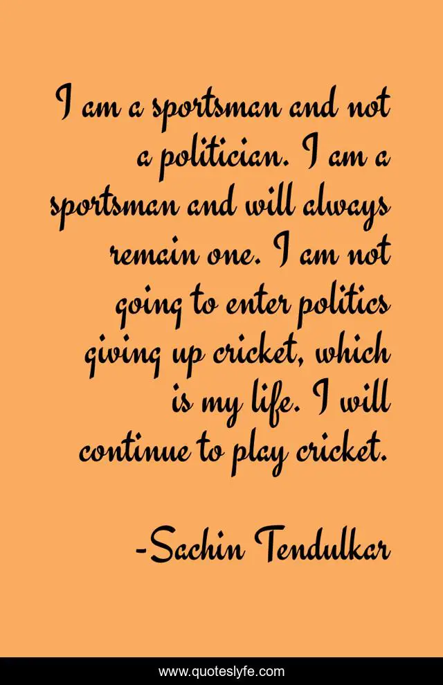 This page presents the quote "I am a sportsman and not a politician. I am a sportsman and will always remain one. I am not going to enter politics giving up cricket, which is my life. I will continue to play cricket.". Author of this quote is Sachin Tendulkar. This quote is about giving, life,.