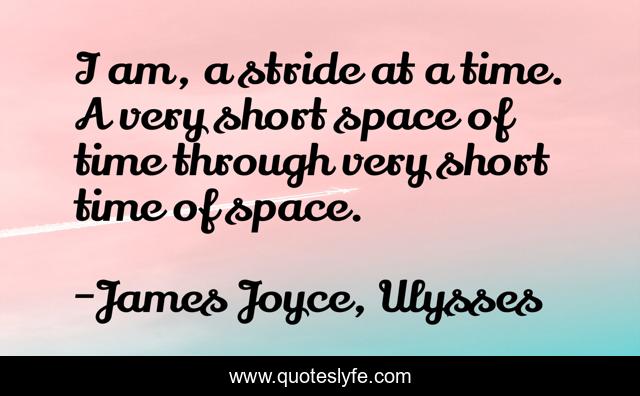 This page presents the quote "I am, a stride at a time. A very short space of time through very short time of space.". Author of this quote is James Joyce, Ulysses. This quote is about existence, space, time,.