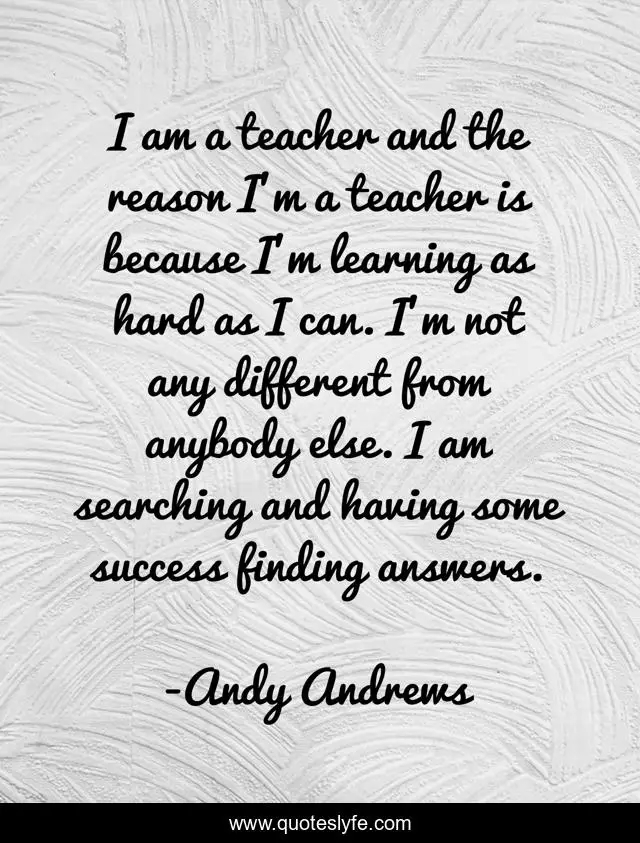 This page presents the quote "I am a teacher and the reason I'm a teacher is because I'm learning as hard as I can. I'm not any different from anybody else. I am searching and having some success finding answers.". Author of this quote is Andy Andrews. This quote is about success, learning,.