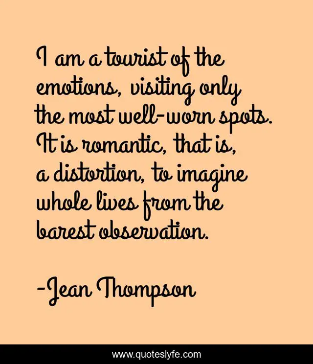 This page presents the quote "I am a tourist of the emotions, visiting only the most well-worn spots. It is romantic, that is, a distortion, to imagine whole lives from the barest observation.". Author of this quote is Jean Thompson. This quote is about emotion, bias, misunderstanding, misapprehension,.