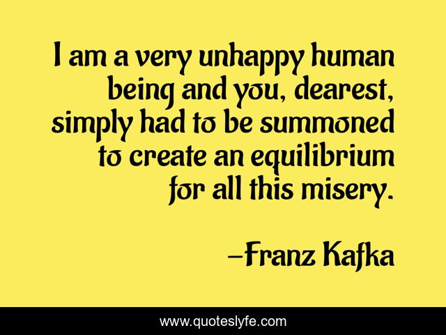 This page presents the quote "I am a very unhappy human being and you, dearest, simply had to be summoned to create an equilibrium for all this misery.". Author of this quote is Franz Kafka. This quote is about relationships, love, letter, misery, affection, equilibrium,.