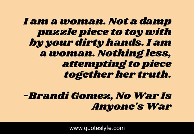 This page presents the quote "I am a woman. Not a damp puzzle piece to toy with by your dirty hands. I am a woman. Nothing less, attempting to piece together her truth.". Author of this quote is Brandi Gomez, No War Is Anyone's War. This quote is about woman, brandi-gomez, truth,.