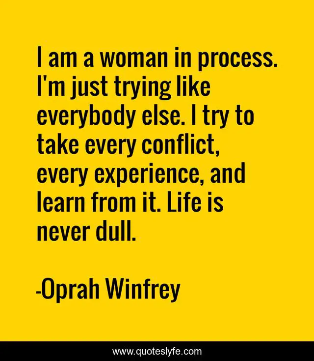 This page presents the quote "I am a woman in process. I'm just trying like everybody else. I try to take every conflict, every experience, and learn from it. Life is never dull.". Author of this quote is Oprah Winfrey. This quote is about life, experience,.